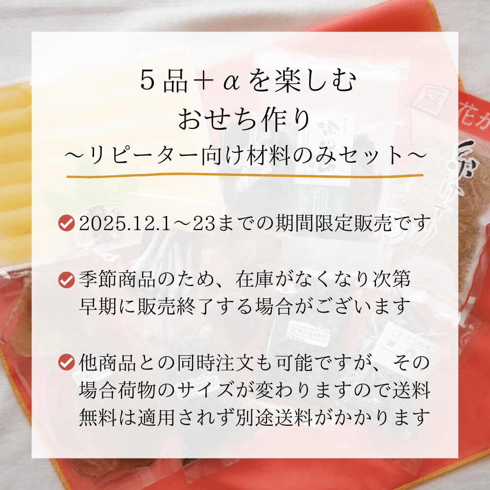 ※こちらは昨年までに5品セットをご購入いただいたリピーターの方向けの材料のみセットです。動画レシピ及び紙レシピはついておりませんのでご注意ください※